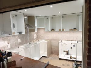 We zijn nu een aantal weken verder en de nieuwe vloer ligt er in. Ook de keukenkasten hangen. Dus het schiet al aardig op