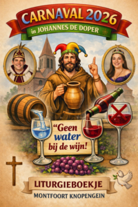 Thema van de viering in de kerkVoor onze viering is het motto: ‘Geen water bij de wijn’ gekozen. We mogen samen het leven vieren, aandacht hebben voor elkaar en gemeenschap ervaren. Maar carnaval is meer dan uitbundigheid alleen. Het is ook een moment van loslaten, omkeren en met een glimlach ruimte maken voor wat echt telt. Juist daarin raakt carnaval aan de betekenis van de Veertigdagentijd die volgt.