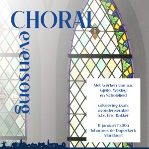 In Montfoort vindt op zondag 11 januari om 15:00 uur een Evensong plaats in de Johannes de Doper, geleid door pater Henny Slot. Te gast is het Avondensemble uit Huizen, o.l.v. Eric Bakker mee. George Pluimakers bespeelt het orgel.